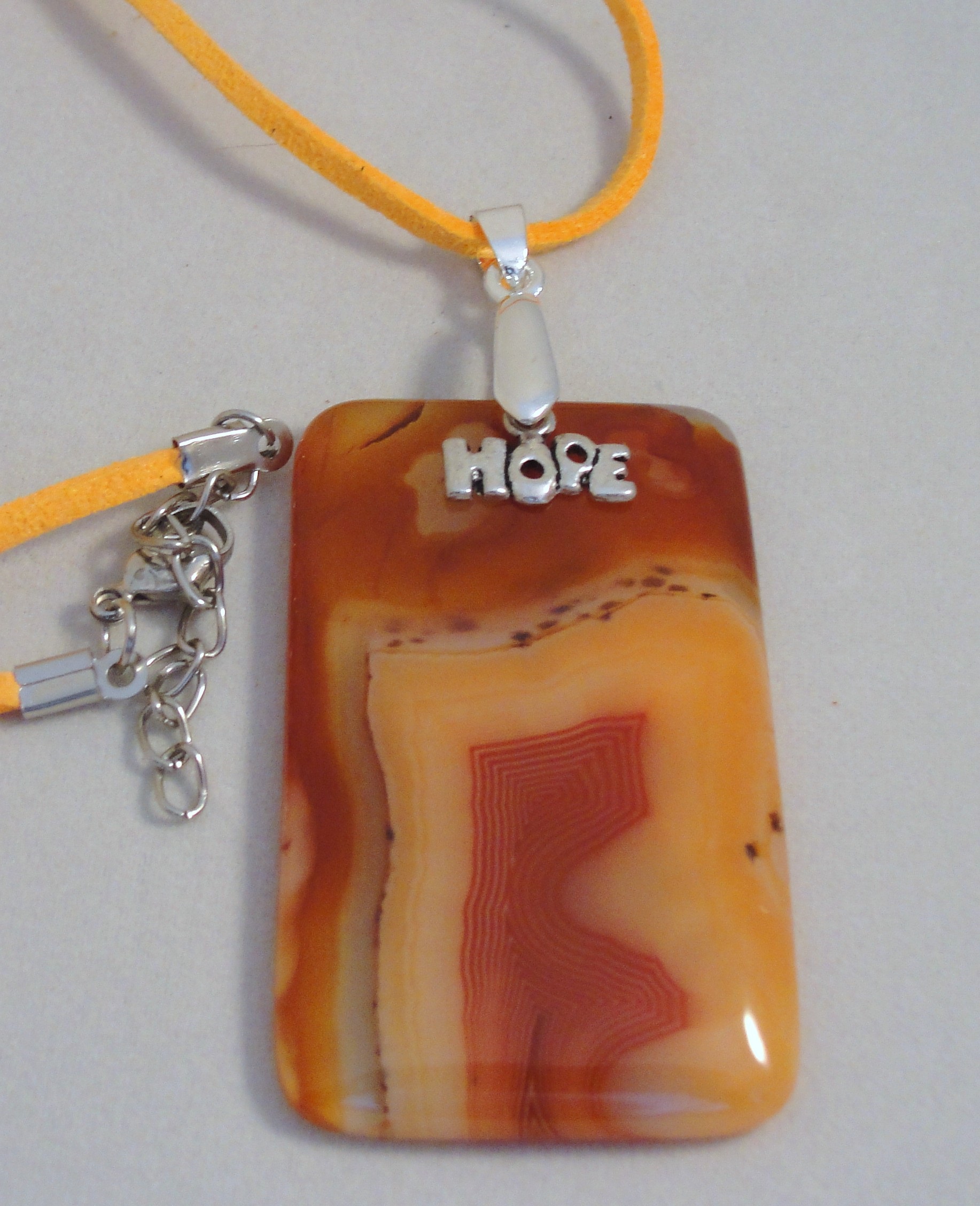 MADE WITH STONE AND METAL CHARM. ORANGE CORD MEASURES 18" WITH 20" EXTENSION.