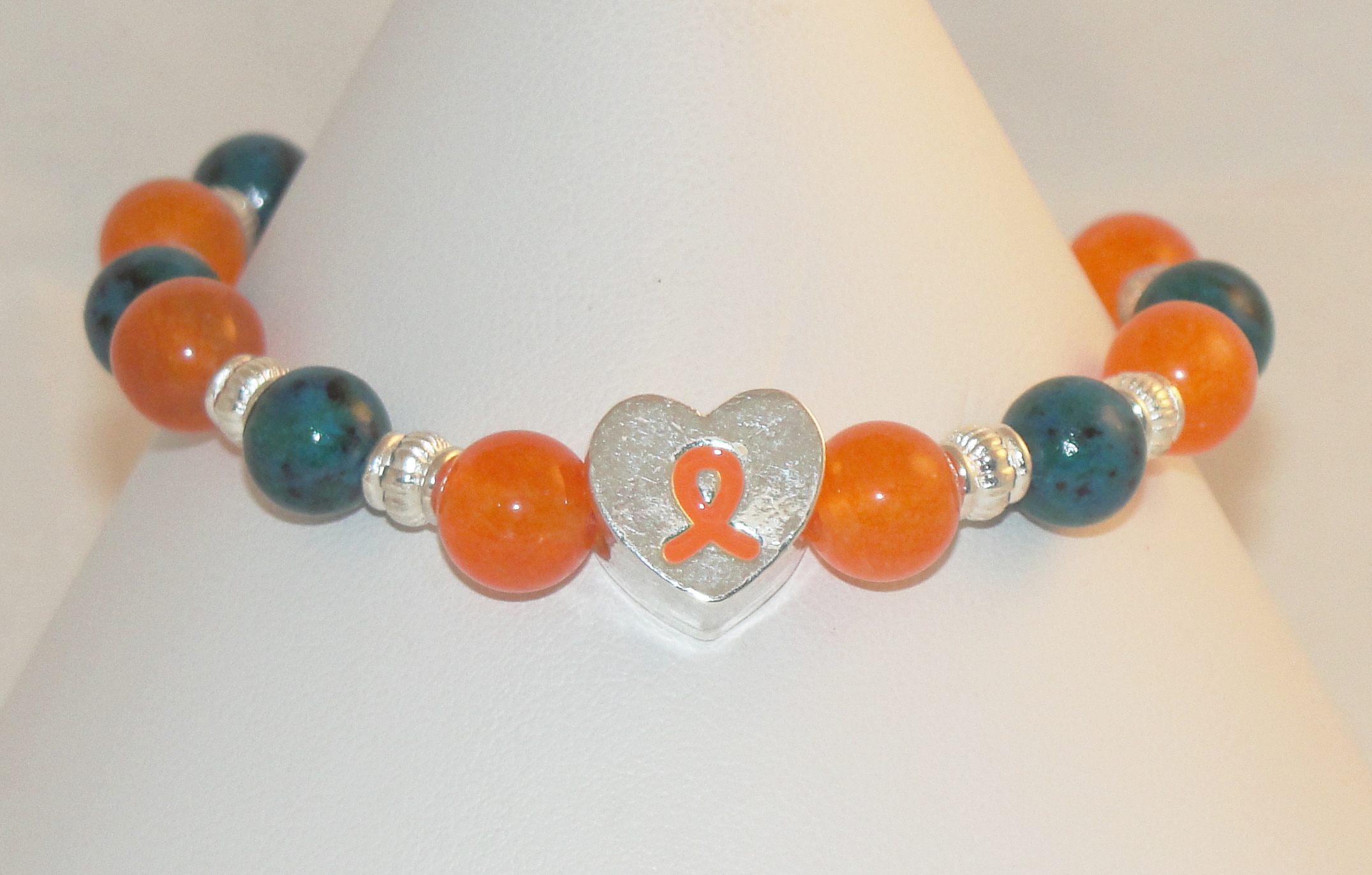 STRUNG 8" LONG (UNSTRETCHED) MADE WITH GLASS AND METAL BEADS ORANGE RIBBON HEART CHARM