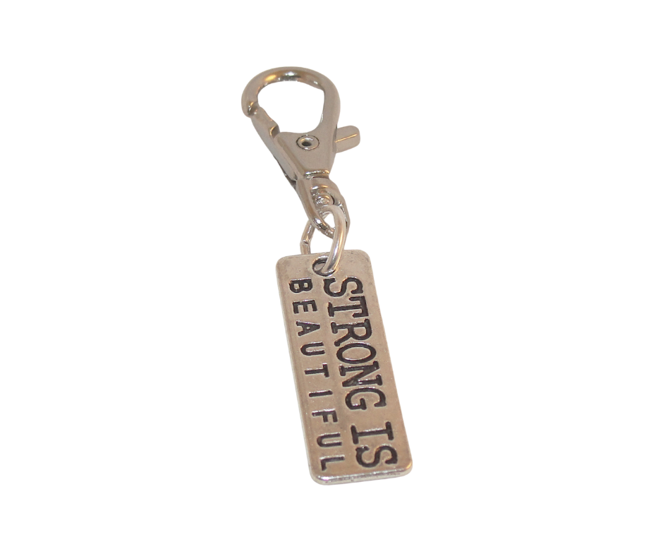 STRONG IS BEAUTIFUL ZIPPER PULL 2" LONG. SWIVEL LOBSTER CLASP
